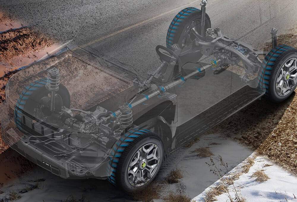 الدفع الرباعي (نظام BorgWarner) + وضع التضاريس المتعددة (الرمال والطين والثلج)